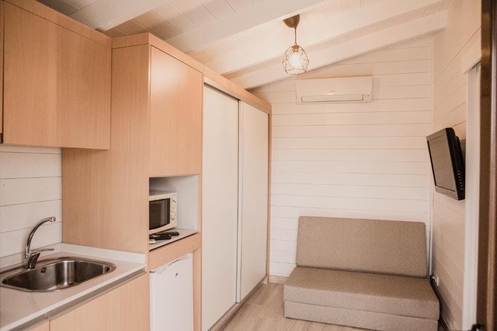 In our cozy and modern Bungalows, you can rest and enjoy in the balcony a privileged view over the garden. The evenings are the unmissable moment during your stay! Comprising bedroom with a double bed, private bathroom, living room with sofa bed and kitchenette. Equipped with mini-fridge, microwave, basic kitchen utensils, electric hob, TV, hairdryer and air conditioning. Free Wi-Fi.